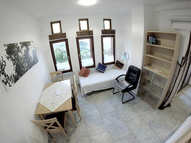 Das Apartment ist ein ca. 40 m² großes Apartment im 1.Stock und nur über 28 Stufen zu erreichen. Es ist lichtdurchflutet, 7 große Fenster , 5 kleine Fenster und eine große Glastüre zur großen überdachten Balkonterasse geben einen phantastischen Rund- und Panoramablick auf den Strand, die Ägäis und das Piliongebirge frei. Die Einzimmer-Ferienwohnung ist aufgeteilt in einen Schlafbereich mit Doppelbett, Wohnbereich mit bequemer Sitzecke, Doppel-Schlafcouch und gut ausgestatteter Küchezeile und Badezimmer. Es ist für 2-3 Erwachsene konzipiert oder 2 Erwachsene und 2 Kinder.